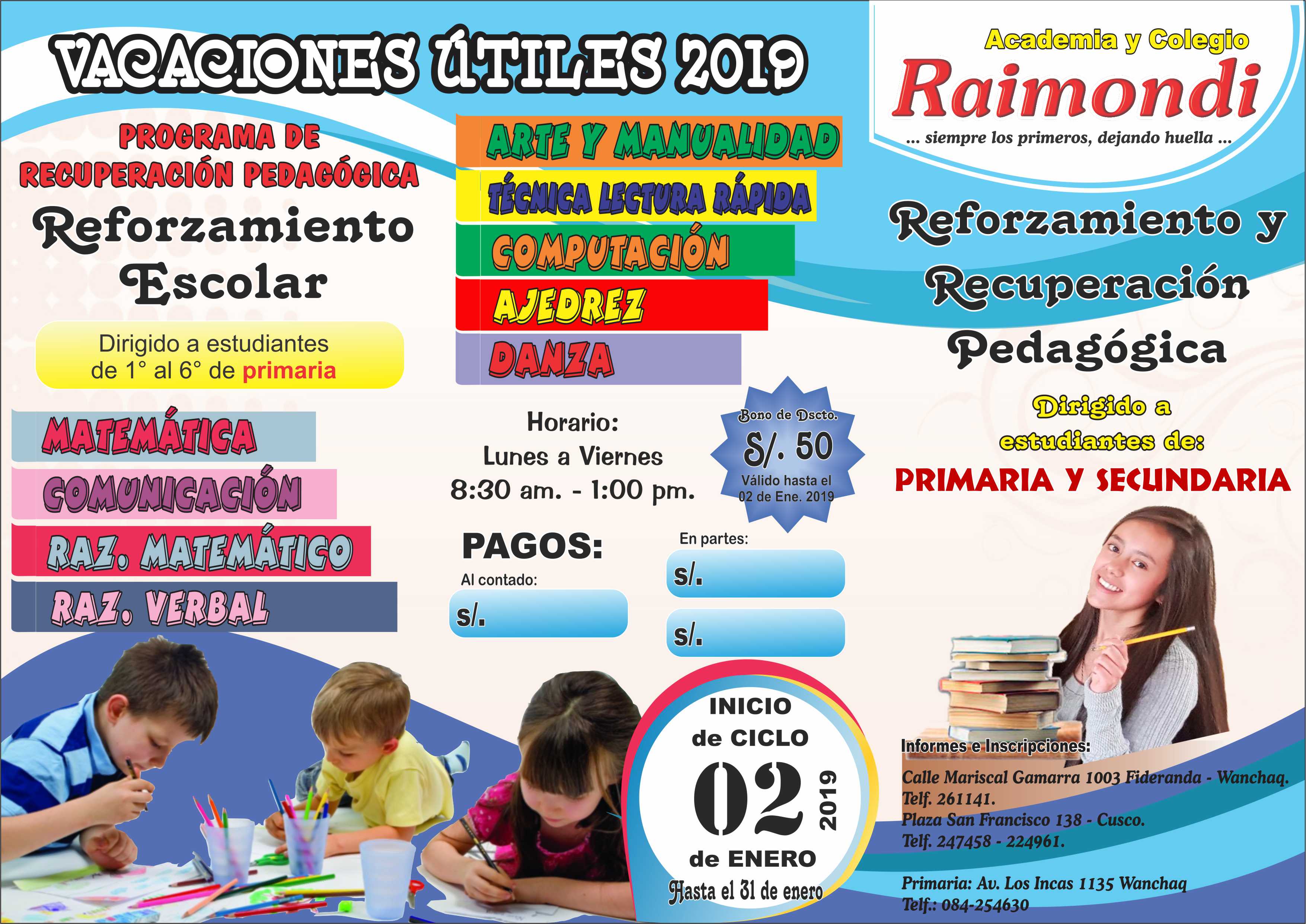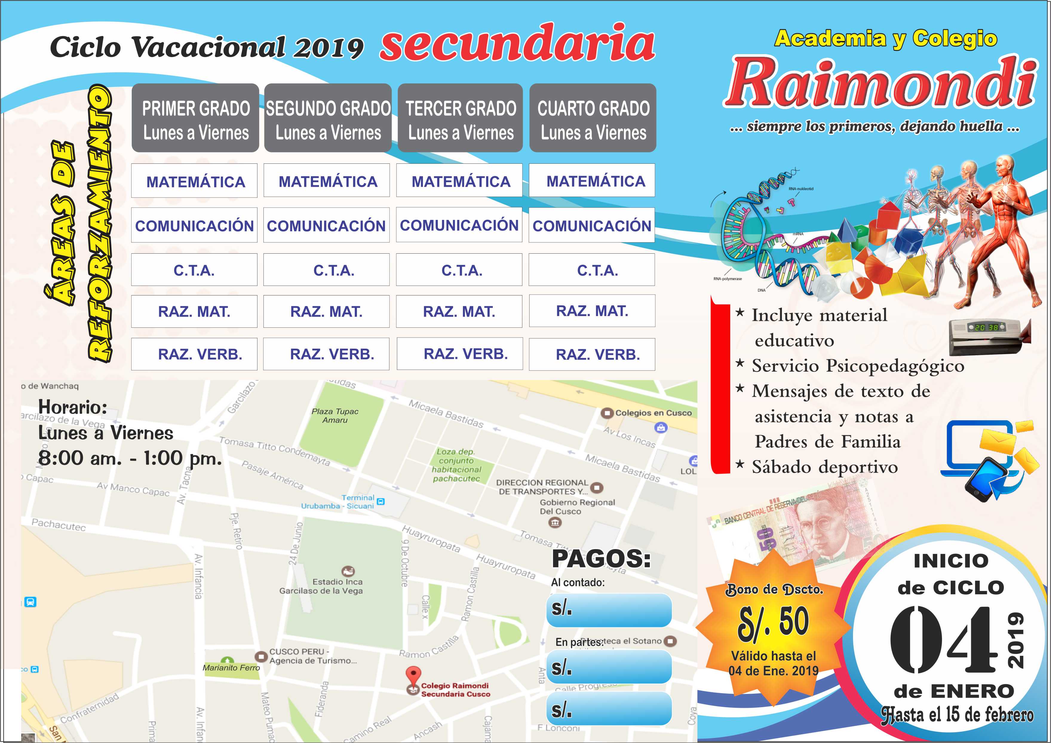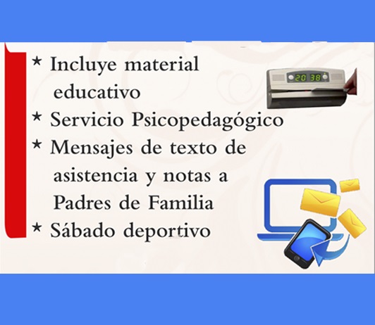 Material Educativo,Servicio Psicopedagógico, control de asistencia y envio de notas vía mensajes de texto a los padres de familia y sábado deportivo